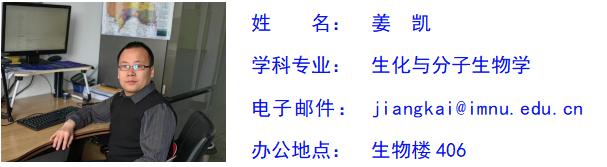 姜凯,男,汉族,中共党员,理学博士,副教授,学术型硕士研究生指导教师,现任3003新葡的京集团生物科学系主任。研究方向为微生物资源开发与利用、CPR及DPANN等未难培养微生物的可培养研究。主持国家自然科学基金项目1项,内蒙古自然科学基金项目1项,内蒙古自治区直属高校基本科研业务费项目1项,内蒙师范大学校级项目2项。在《Microbial Biotechnology》、《Archives of Microbiology》、《Scientific Reports》和《微生物学通报》等刊物发表论文10余篇,参编专著2部。承担“微生物学”、“微生物学实验”、“生物安全”、“无机化学实验”、“科学精神”等本科及研究生课程。
