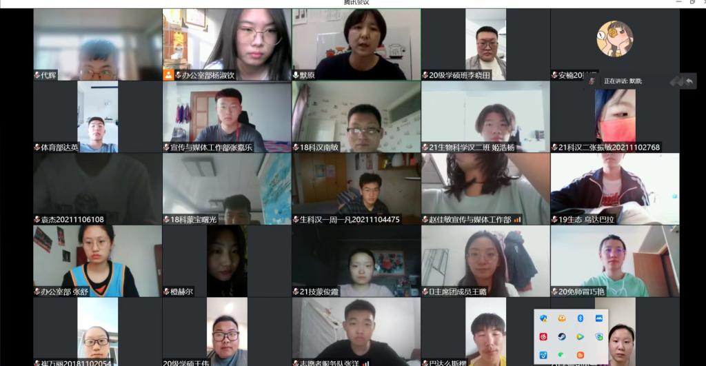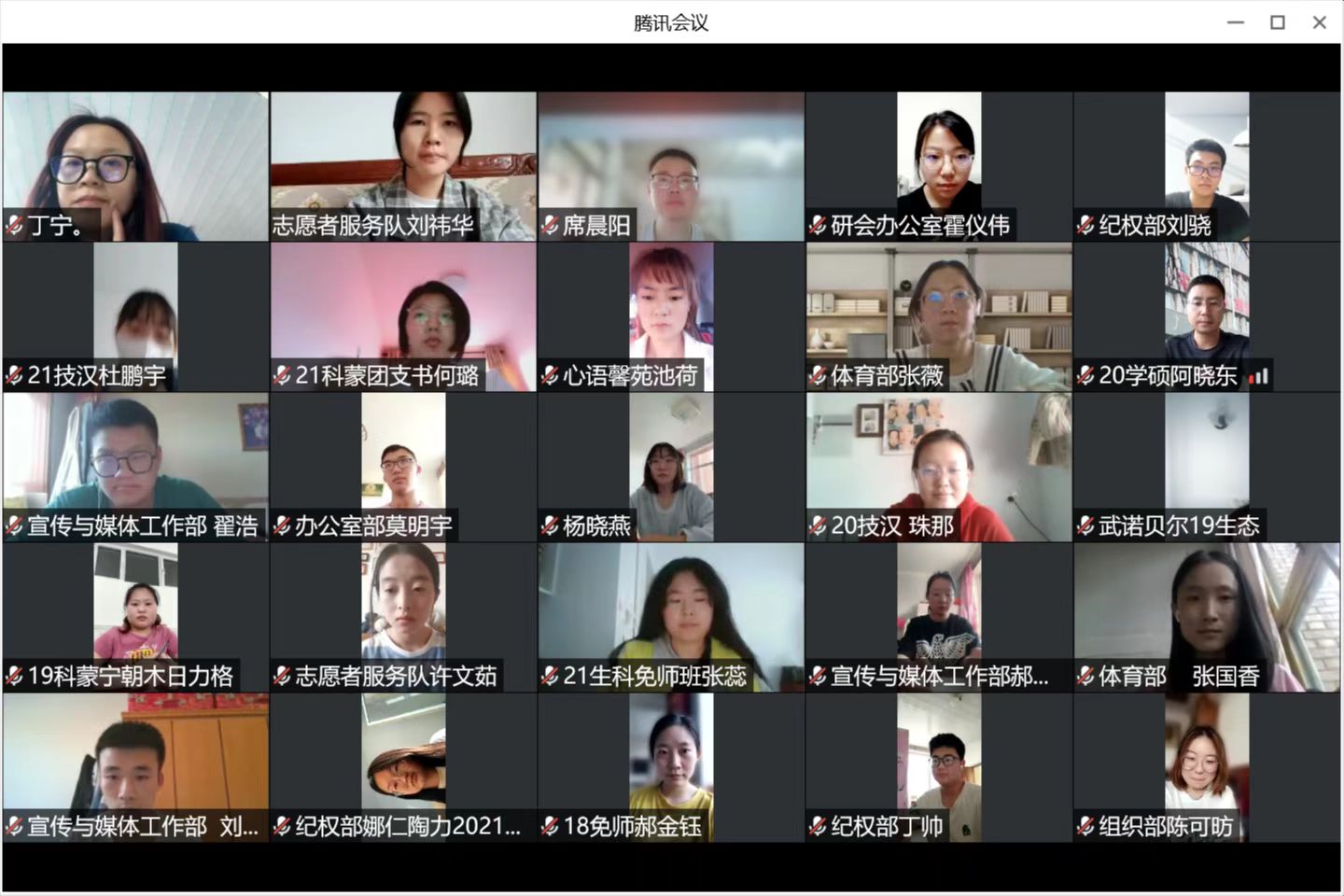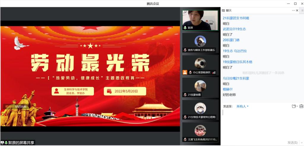5月20日,3003新葡的京集团召开了“劳动教育宣传月”活动交流推进会,分为研究生专场和本科生专场分别在线上召开,学就办主任默原老师、团总支副书记李自蹊老师、辅导员胡日查老师出席了会议。在两场会议上,学就办组织学生干部深入学习了习近平总书记在全国教育大会上的讲话精神和自治区相关文件,分别向研究生和本科生学生干部解读了新葡京官网《“学生劳动教育宣传月”实施细则》,并就近期新葡京官网所开展的“劳动教育宣传月”的活动进展进行了阶段性汇报,并听取了学生会各部门在实施劳动教育宣传活动的工作进展和各班实施劳动教育的典型做法。