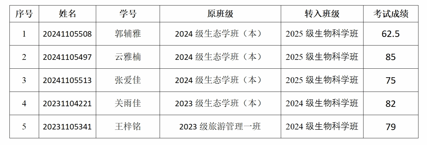 根据《关于2025年本科生转专业工作安排的通知》(内师教发[2025]14号),学院于4月15日成立转专业工作领导小组并制定细则,根据细则要求,本着“公正、公平、自愿、公开”的原则,按照报名转专业同学笔试成绩排名,新葡京官网拟同意以下5名同学的转专业申请。具体公示如下: